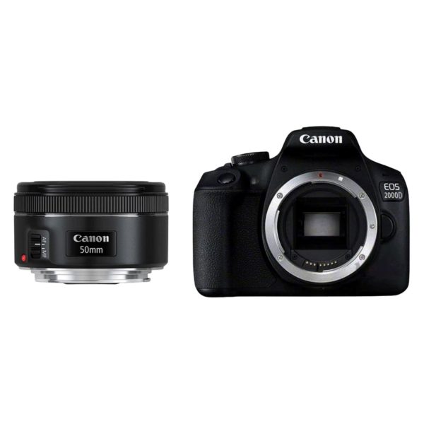 دوربین DSLR کانن مدل EOS 2000D، حسگر APS-C با دقت موثر 24.1 مگاپیکسل، عکاسی پیاپی 3 فریمبرثانیه، فیلمبرداری با رزولوشن HD و Full HD، نمایشگر ثابت، همراه با لنز 50 میلیمتری با بیشترین گشودگی دیافراگم f/1.8